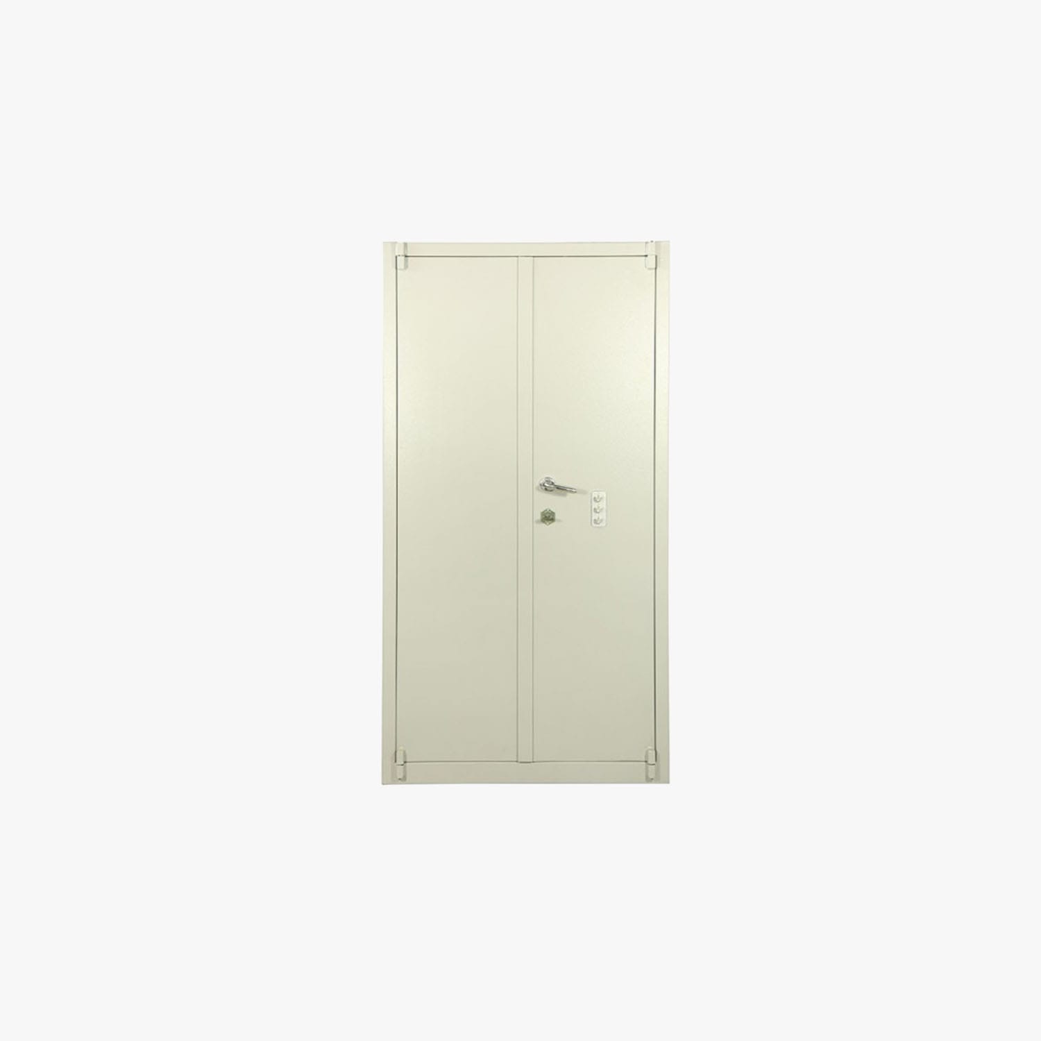 Porte en tôle 20/10 à double parois, montée sur paumelles extérieures permettant l’ouverture complète à 180°, barre d’accrochage du côté pivots.