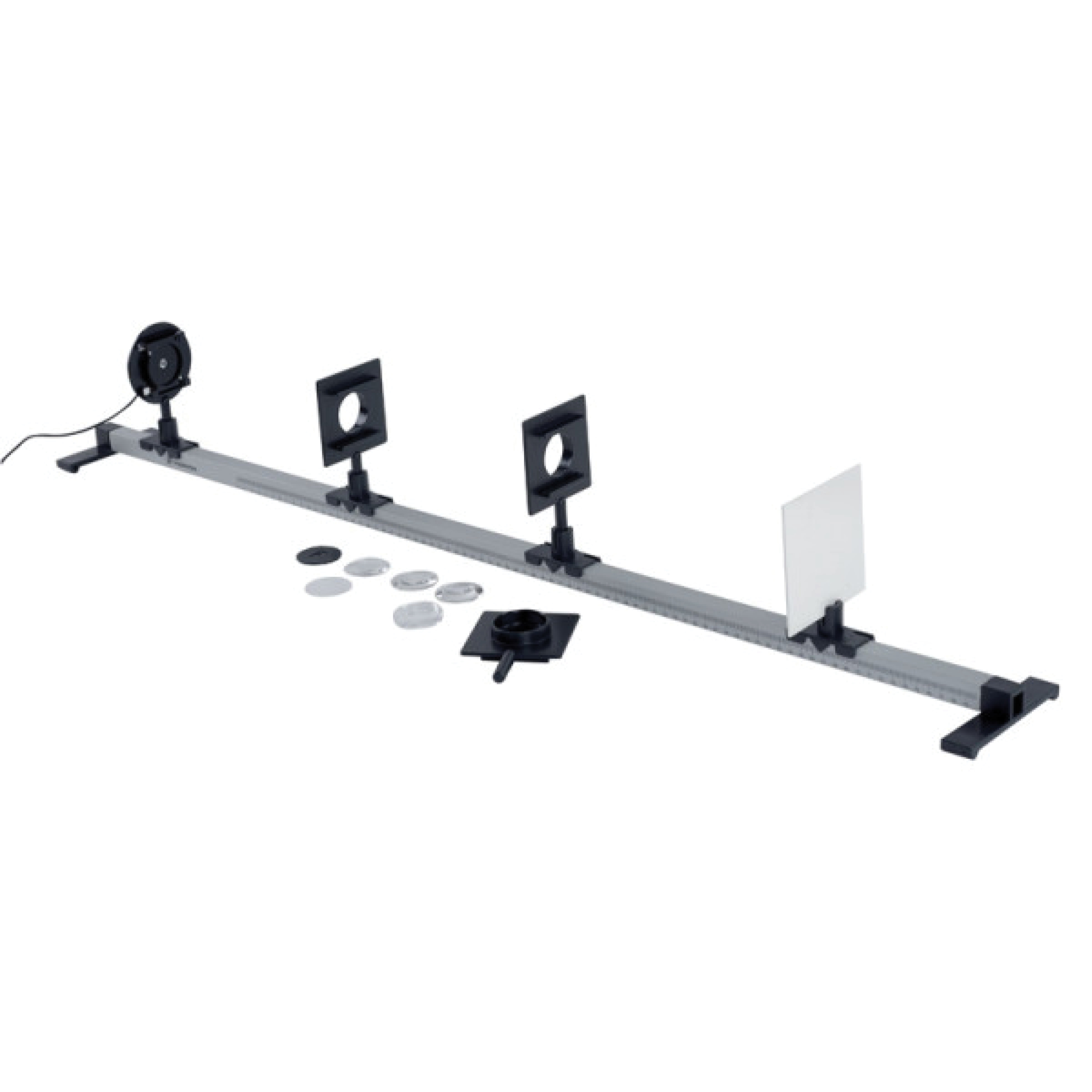 Grâce à ses deux pieds, le banc est parfaitement stable. Le positionnement des cavaliers est aisé. Les graduations bien visibles vous permettent de repérer parfaitement la position de chaque accessoire. Les deux porte-lentilles sont adaptés aux lentilles de Ø 40 mm. Chacun d’eux peut même accepter deux lentilles. C’est un véritable atout pour l’étude des défauts de l’œil et de ses corrections. Un porte-lentille / porte-filtre, livré dans l’ensemble, vous permettra d’utiliser vos filtres colorés pour traiter par exemple la synthèse additive des couleurs.