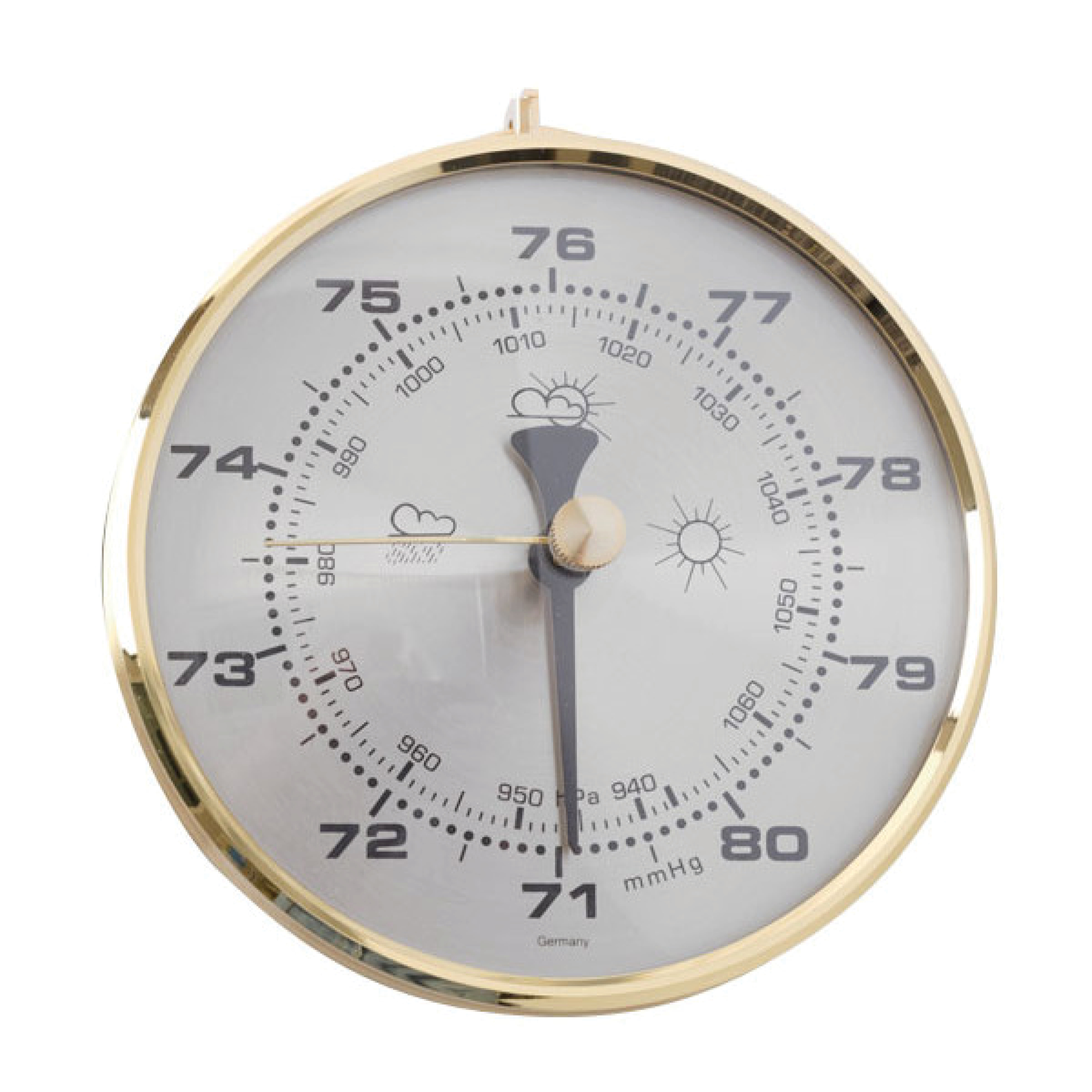 Graduation en hectopascal et en millimètres de Hg. Précision : +/-2 mbar. Équipé d’une vis de réglage en fonction de l’altitude, à l’arrière de l’appareil, et d’un index manuel à l’avant.