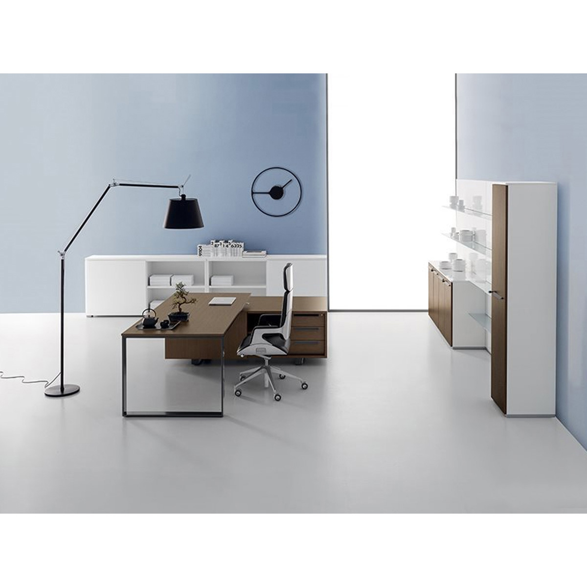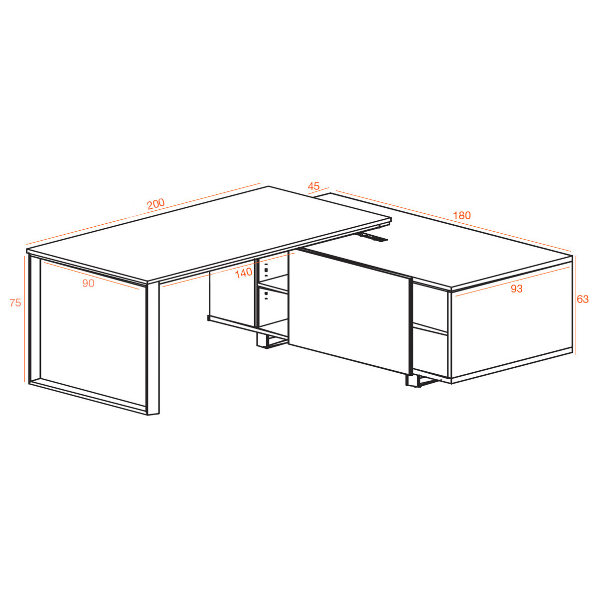 L’élégance des volumes definis le bureau de direction SYNDRA sur crédence. La gamme accueillante et confortable par son large plateau en bois mélaminé L200 cm, s’exalte par les diverses finitions chromatiques disponibles, qui rend cette gamme actuelle et intemporelle. Une ligne de direction élégante et minimale qui se distingue par la fonctionnalité de sa desserte composée d’un caisson 3 tiroirs avec poignées assortis aux pieds de la crédence et multiples rangements.