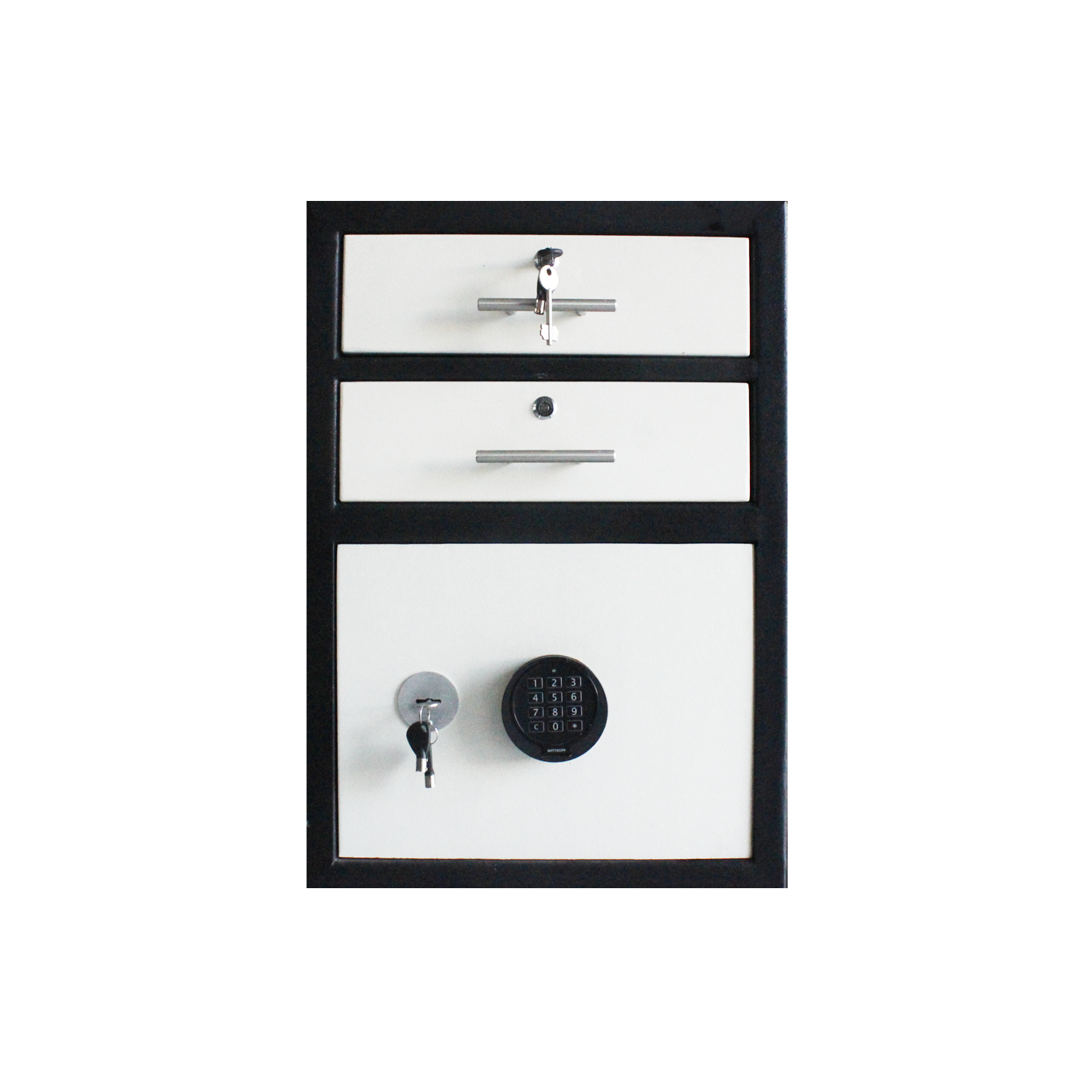 Doté de 2 tIrroirs 1 Supérieur et 1 inférieur: Le tiroir inferieur a une façade de 110mm de hauteur en tôle d’acier pliée pour lui assurer une bonne rigidité. Il est équipé d’une poignée de manipulation et d’une serrure de fermeture clé plate. La partie arrière du tiroir comporte un dispositif permettant le basculement des excédents d’espèces dans le coffre inférieur. L’espace restant dans le tiroir est équipé de cases pour le rangement des billets de banque et des pièces de monnaie. le tiroir supérieur est aux même dimension et est compartimente pour une utilisation en tant que caisse d’échange pour billets et pièces de monnaies métalliques.