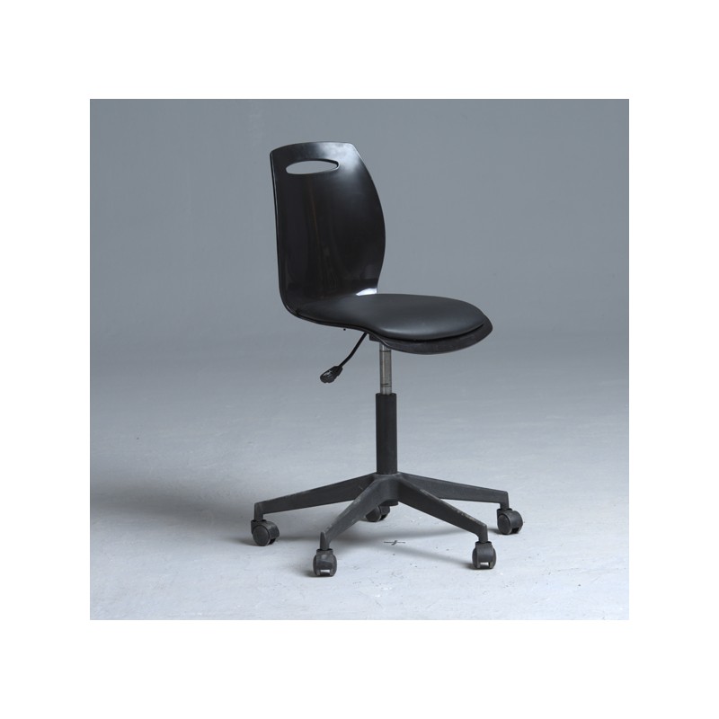 Chaise tournante avec assise en skaï et dossier en hirek et réglage de hauteur.