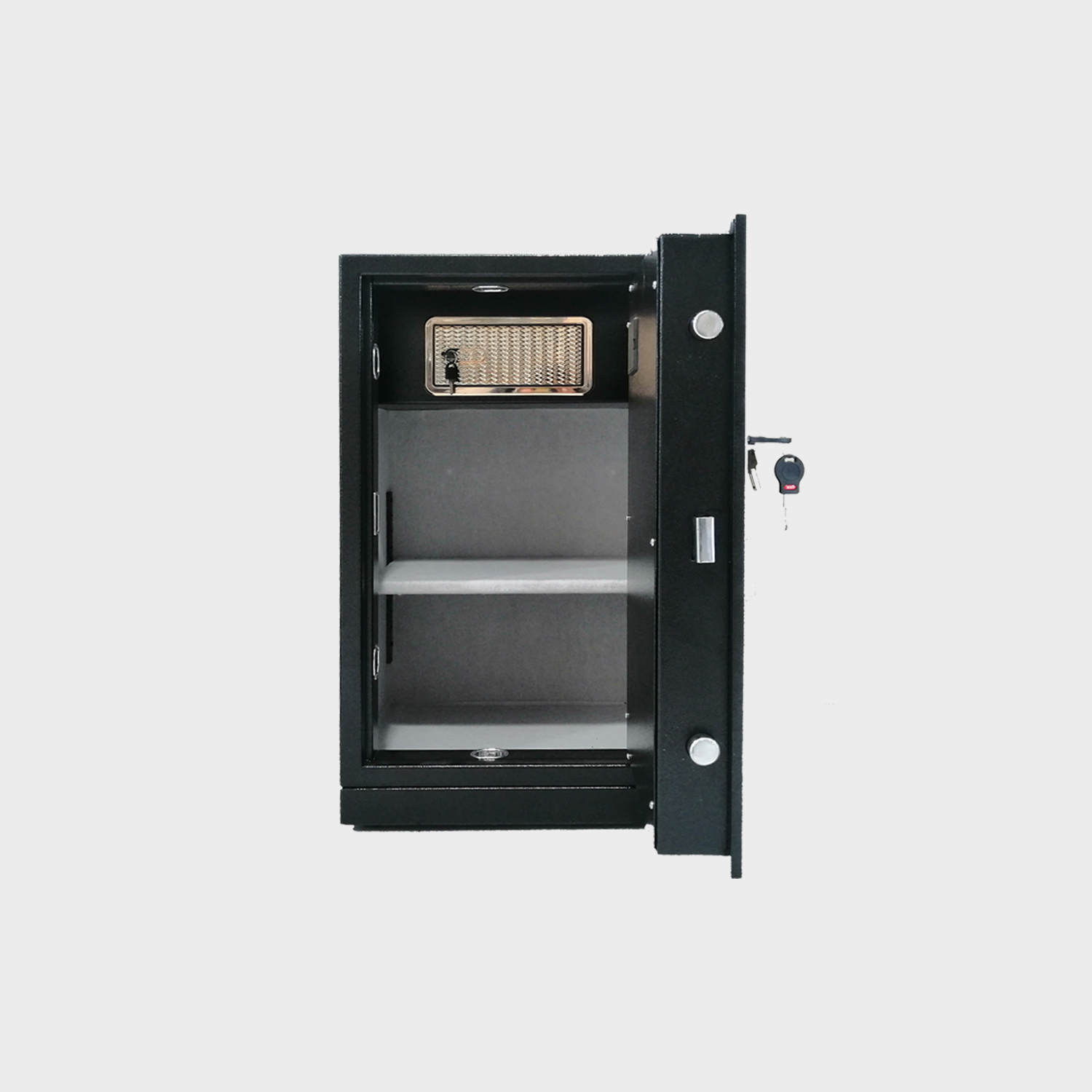 Ce Coffre est munie à l’intérieur d’un trésor soit un coffre intérieur a fermeture par serrure indépendante de la fermeture centrale Ouverture et fermeture par poignée pivotante et combinaison électronique. Affichage digital du code, ouverture d’urgence de la combinaison a l’aide d’une Clé de secours. L’ensemble est traité avec une peinture en poudre époxy cuit au four.
