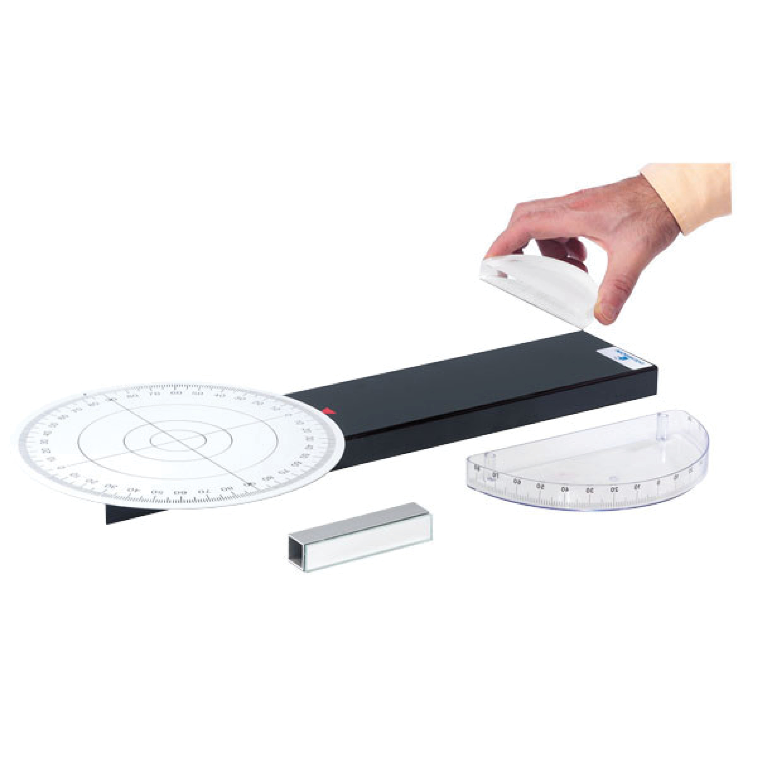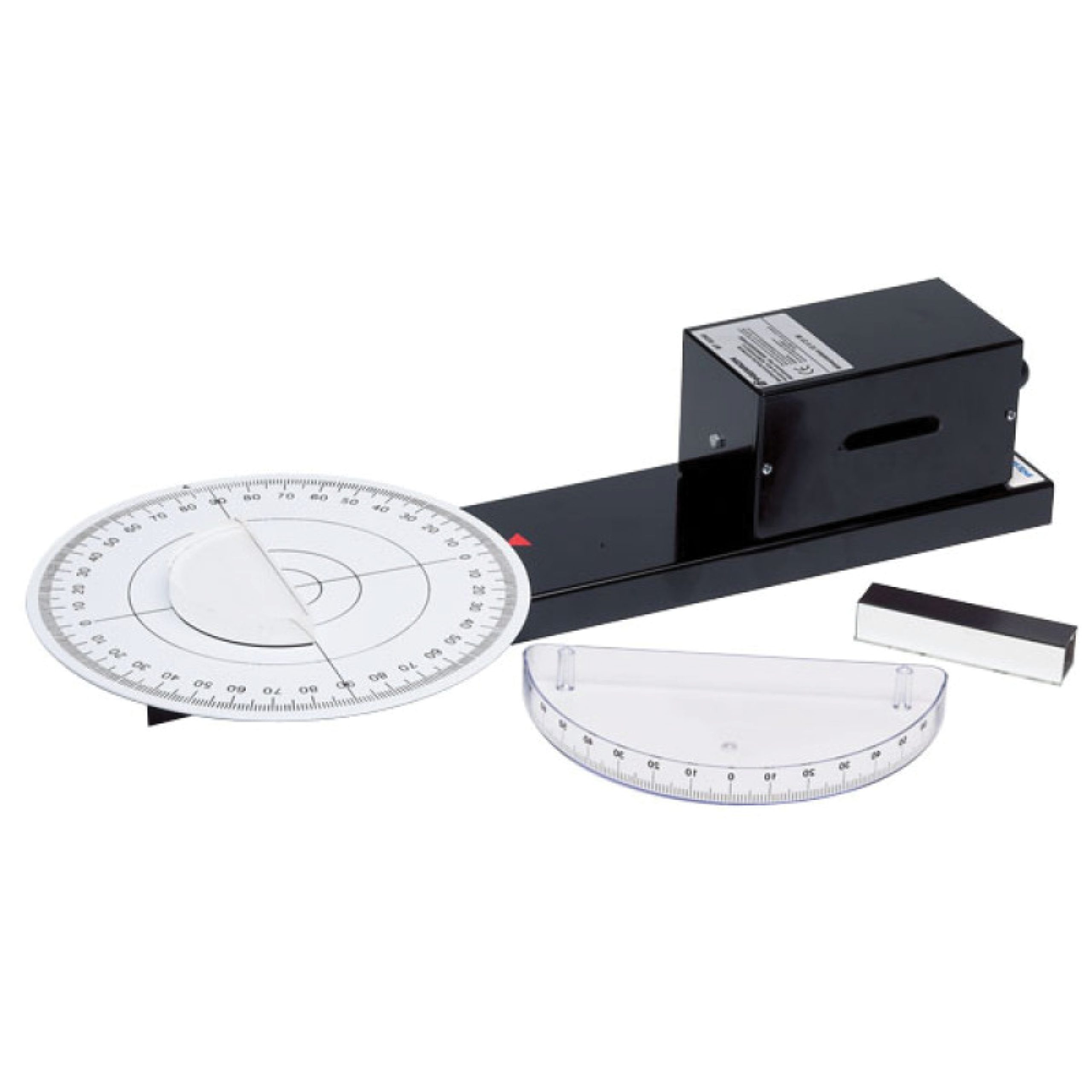 Associé à la source lumineuse à faisceaux rasants, cet ensemble permet de réaliser les expériences les plus courantes pour mettre en évidence les phénomènes de réflexion et réfraction : lumière réfléchie par un miroir pour mettre en évidence la loi de la réflexion : angle incident = angle réfléchi ; lumière réfractée au travers d’une cuve ou d’une lentille demi-circulaire pour démontrer la loi de Descartes : n1.sin i = n2.sin r où i est l’angle d’incidence, r l’angle de réfraction et n1 et n2 les indices de réfraction dans les milieux matériels respectifs.