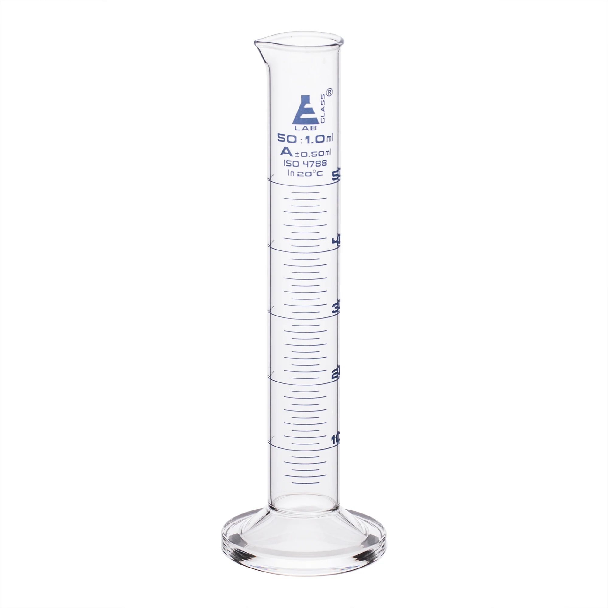 Eprouvette graduée, 50 ml – Classe A – Base ronde – EISCO – Eprouvette graduée de 50 ml fabriqué en verre borosilicate 3.3 de haute qualité et haute résistance. Bec verseur pour un écoulement facile et base ronde pour une stabilité accrue. Tolérance de classe A, ±0,50 ml conformément à la norme DIN EN ISO 4788. Graduations et spécifications imprimées en bleu. Subdivisions de 1 ml. Le cylindre mesure 19 cm de haut, avec une base de 5 cm de large. Le diamètre intérieur du corps du cylindre est de 22 mm (0,8″) et le diamètre extérieur est de 27 mm (1″).