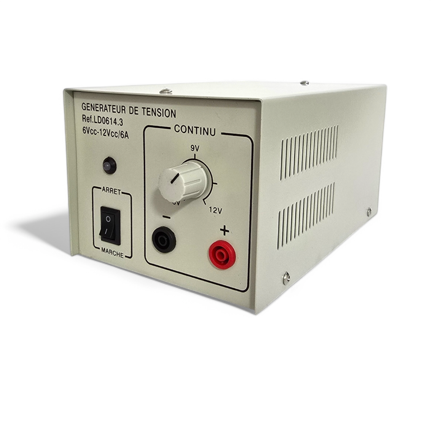 Le générateur de tension continue LD0614.3 est un appareil robuste et fiable conçu pour fournir une tension continue réglable de 6Vcc à 12Vcc avec une intensité maximale de 6A. Il est idéal pour alimenter divers appareils et composants électroniques dans un environnement de laboratoire, d’atelier ou pour des projets électroniques.