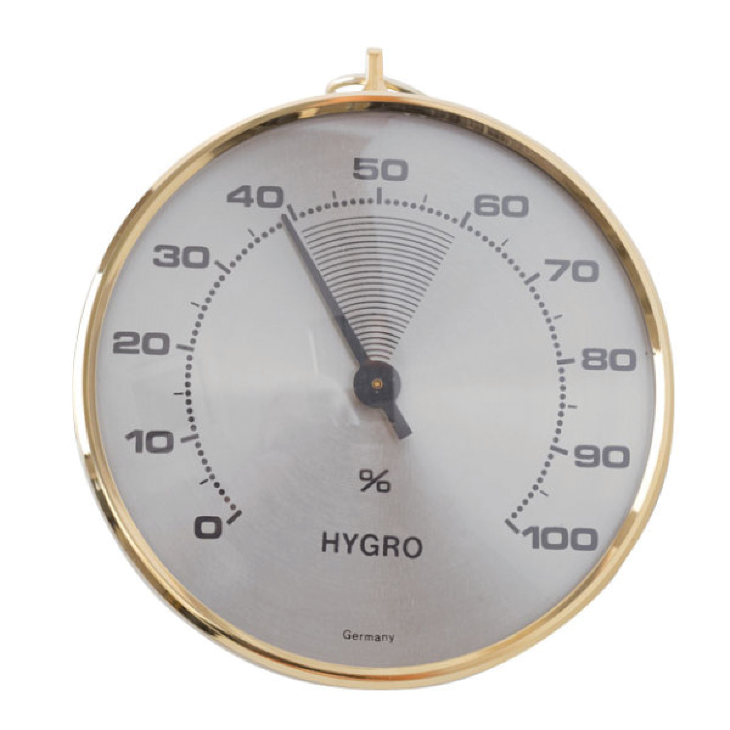 Caractéristiques : Indication du % d’humidité relative de 20 à 100%, en 3 secteurs : trop sec (de 0 à 40), trop humide (de 60 à 100), favorable (de 40 à 60). Valeurs données pour une température ambiante de l’ordre de 20°C.