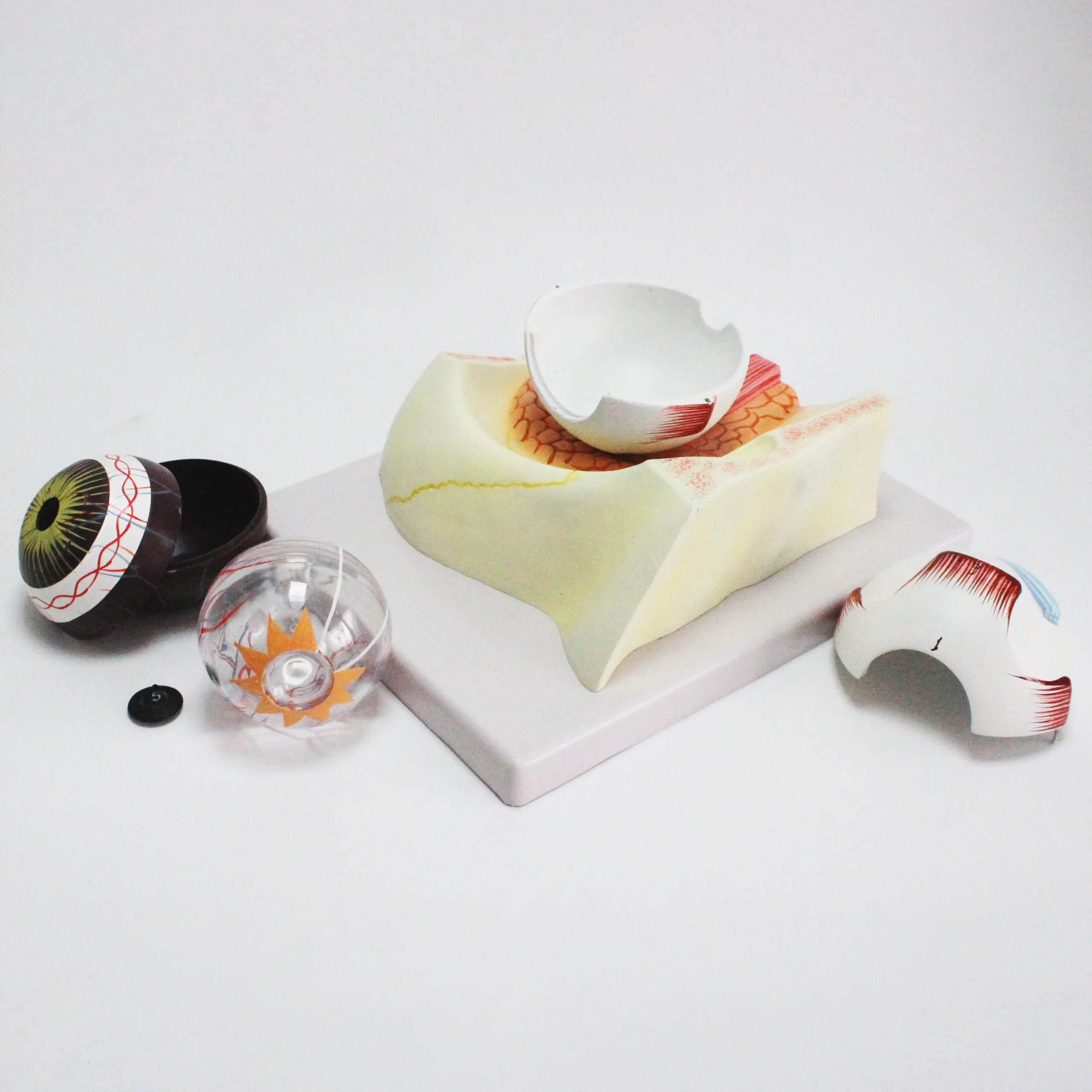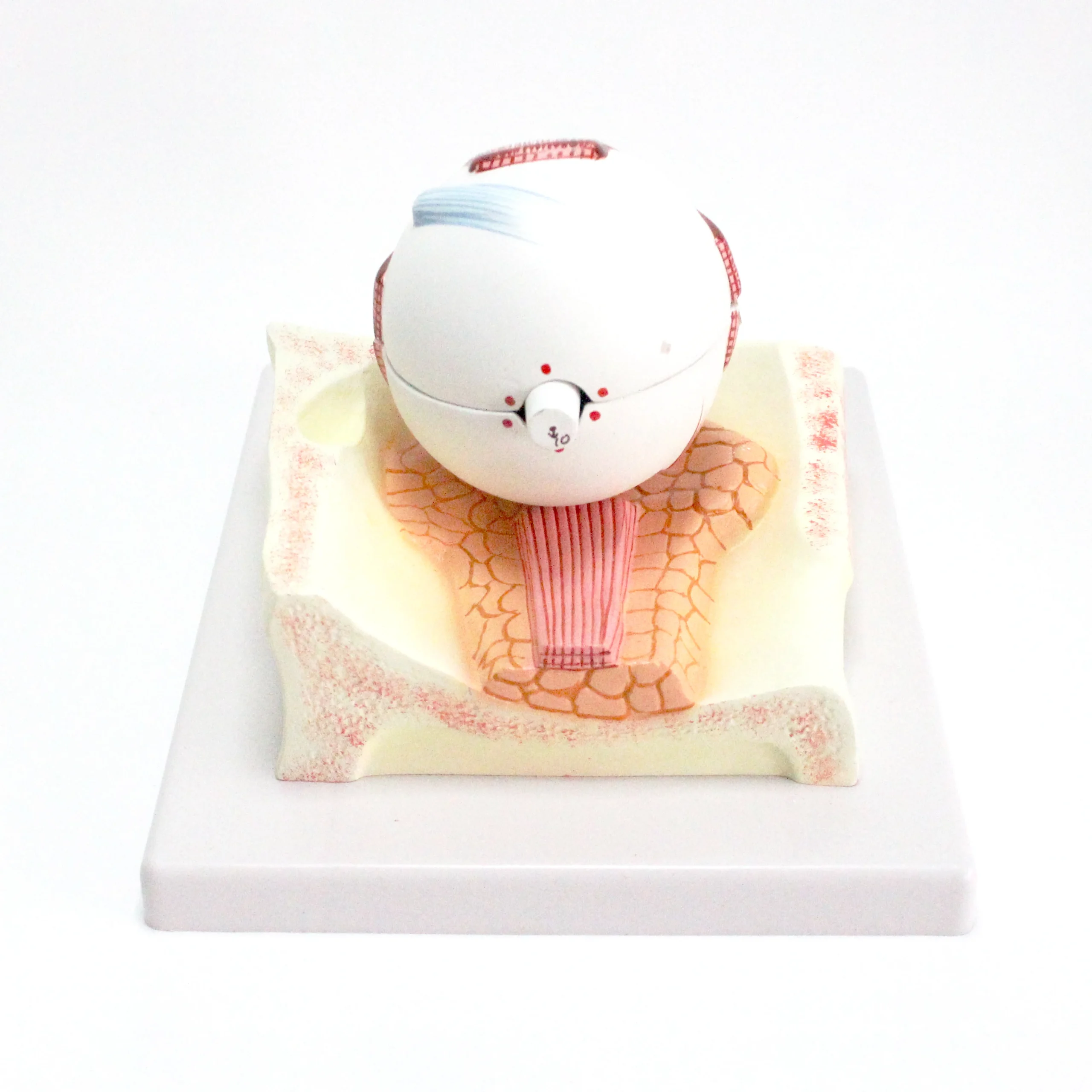 Modèle détaillé agrandi à 3 fois la taille réelle. Moitié supérieure amovible de la sclérotique avec cornée et attaches musculaires oculaires, les deux moitiés de la couche choroïde avec iris et rétine, cristallin et humeur vitrée. Monté sur une base durable avec carte-clé numérotée. Dissécable en 4 parties.