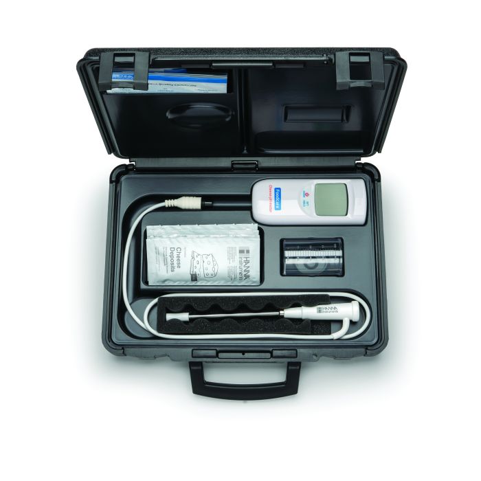 | Ordering Information | Each meter is supplied complete with: • FC2423 preamplified pH/temperature probe with DIN connector and 1 m (3.3’) cable • pH 4.01 & 7.01 Buffer sachet • HI700642 cleaning solution for cheese deposits (2 sachets) • 100 mL beaker (1 pc.) • Alkaline batteries: 1.5V AAA (3 pcs.) • Rugged carrying case • Calibration certificate of meter • Calibration certificate of probe • Instruction manual |